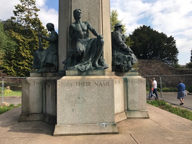 This is the City Memorial erected in competition with the County Memorial outside the Cathedral. It is one of the finest Memorials in our opinion since it is a fine work of art and commemorates in addition to a ‘Tommy’, a sailor and much more unusually a nurse and a prisoner of war.
