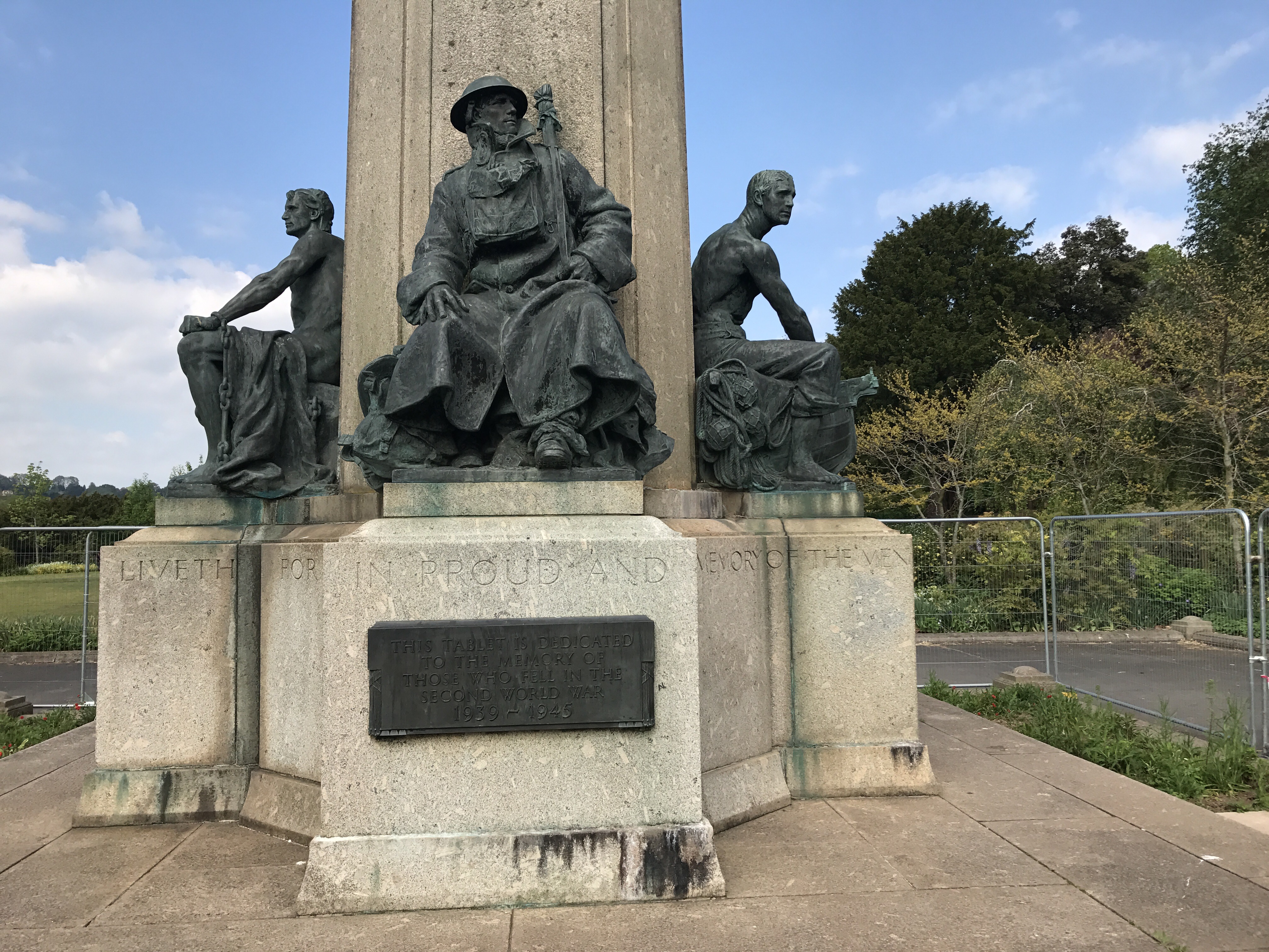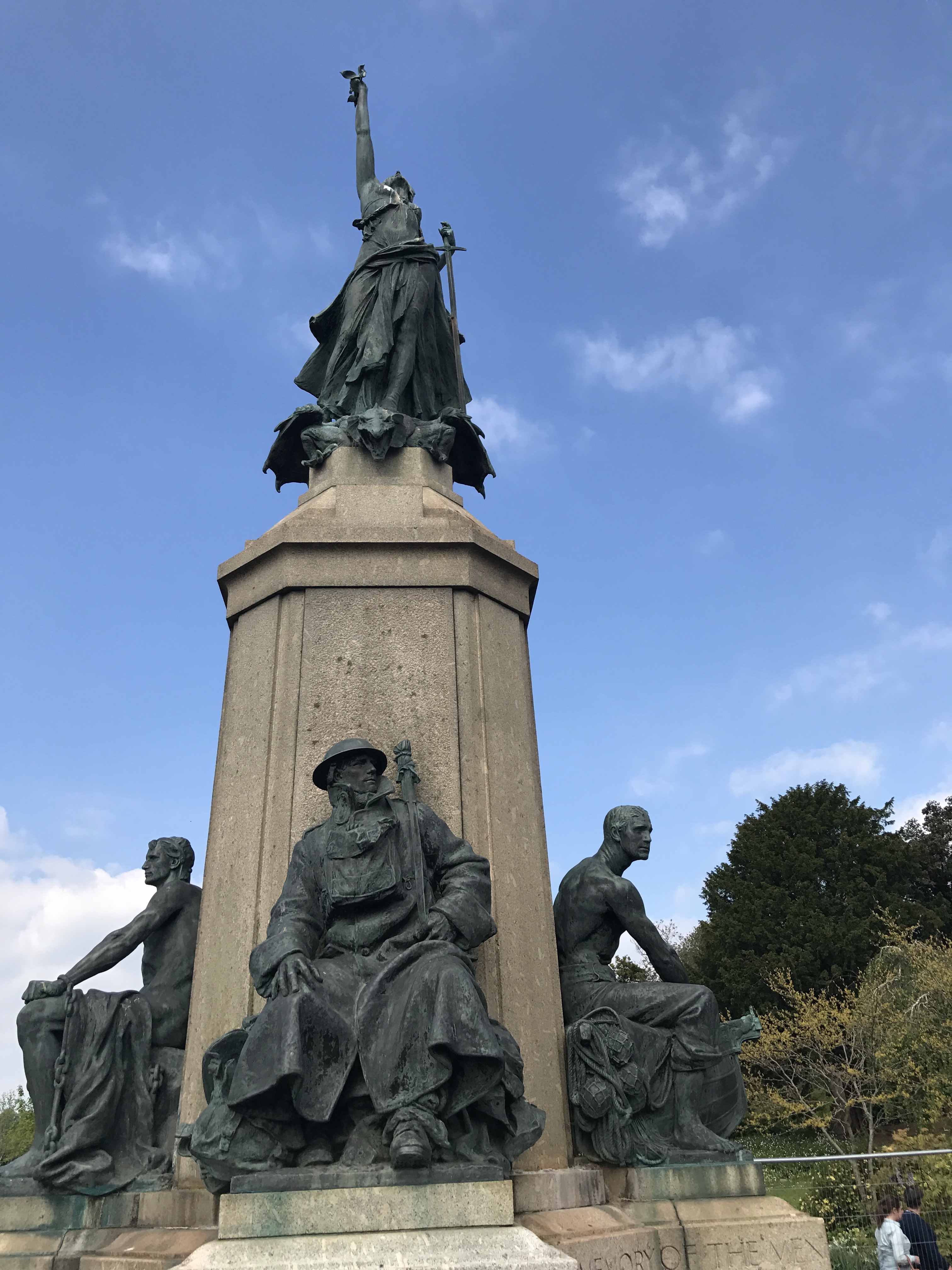 This is the City Memorial erected in competition with the County Memorial outside the Cathedral. It is one of the finest Memorials in our opinion since it is a fine work of art and commemorates in addition to a ‘Tommy’, a sailor and much more unusually a nurse and a prisoner of war.
